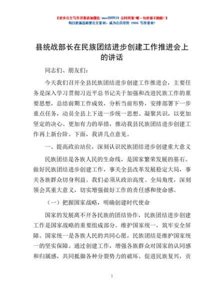 / 县统战部长在民族团结进步创建工作推进会上的讲话