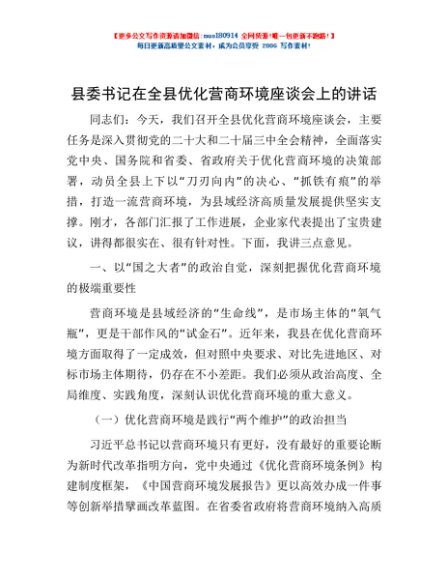 / 县委书记在全县优化营商环境座谈会上的讲话