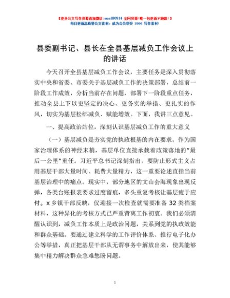 / 县委副书记、县长在全县基层减负工作会议上的讲话