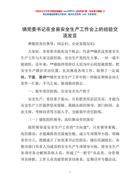 / 镇党委书记在全县安全生产工作会上的经验交流发言
