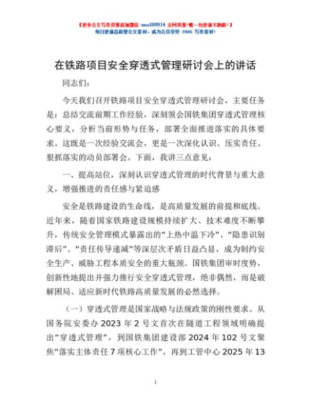 / 在铁路项目安全穿透式管理研讨会上的讲话