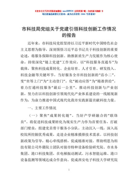 / 市科技局党组关于党建引领科技创新工作情况的报告
