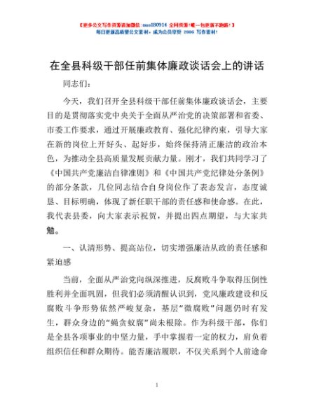/ 在全县科级干部任前集体廉政谈话会上的讲话