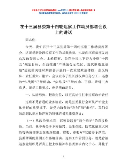 / 在十三届县委第十四轮巡察工作动员部署会议上的讲话