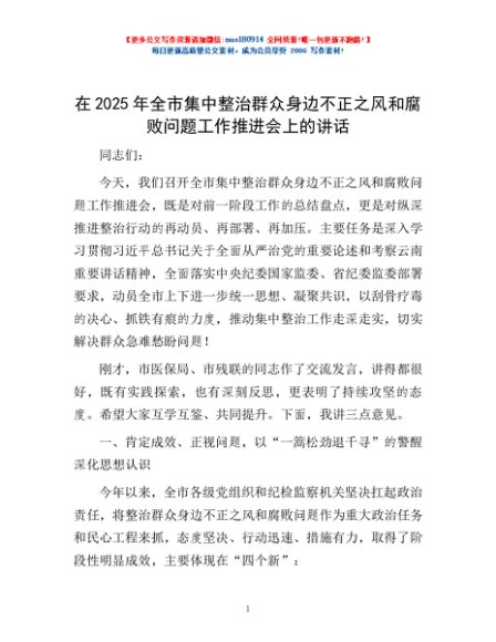 / 在2025年全市集中整治群众身边不正之风和腐败问题工作推进会上的讲话