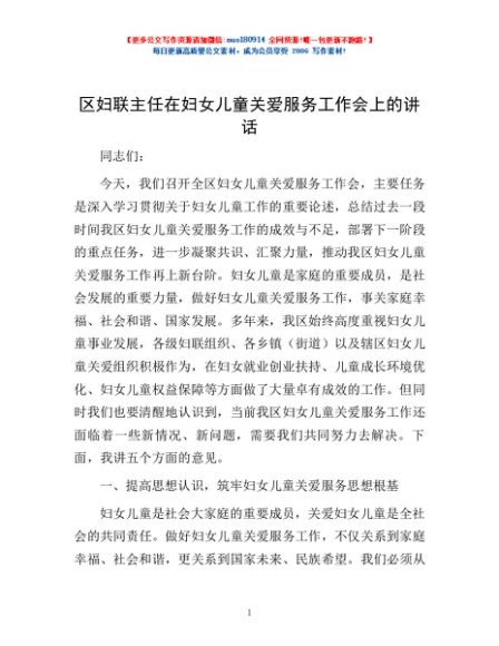 / 区妇联主任在妇女儿童关爱服务工作会上的讲话