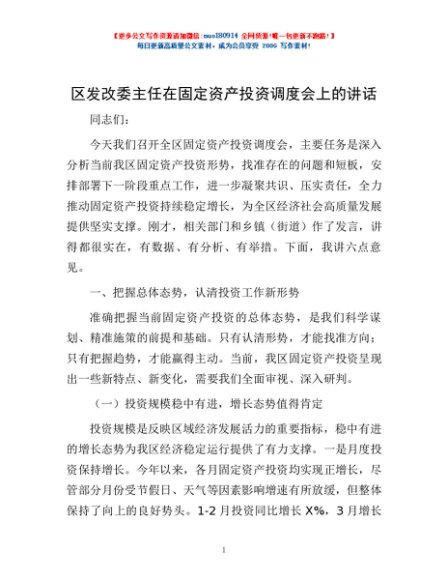 / 区发改委主任在固定资产投资调度会上的讲话