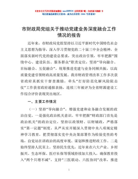 / 市财政局党组关于推动党建业务深度融合工作情况的报告