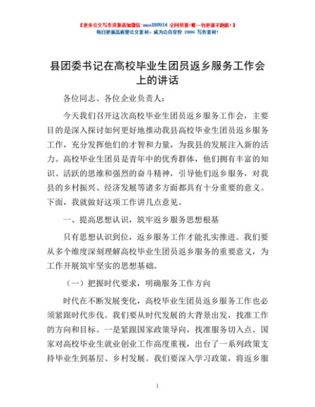 / 县团委书记在高校毕业生团员返乡服务工作会上的讲话