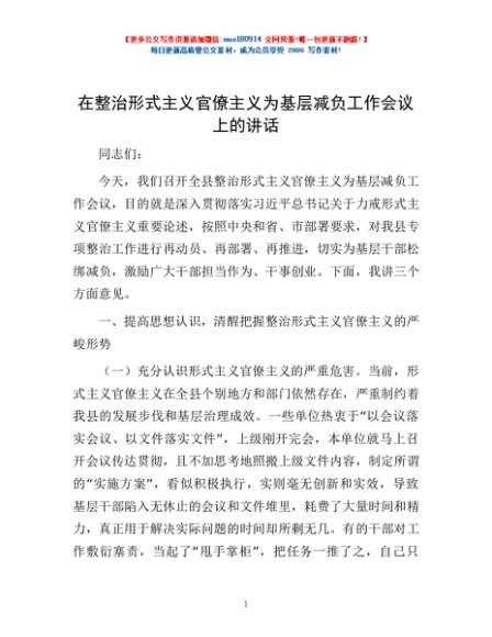 / 在整治形式主义官僚主义为基层减负工作会议上的讲话