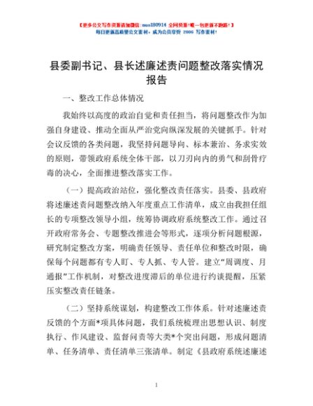 / 县委副书记、县长述廉述责问题整改落实情况报告