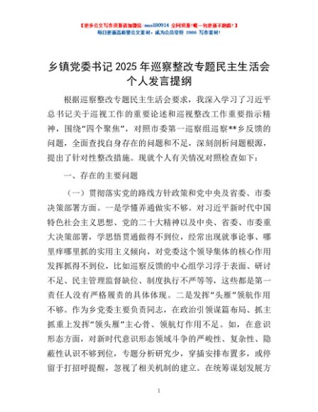 / 乡镇党委书记2025年巡察整改专题民主生活会个人发言提纲