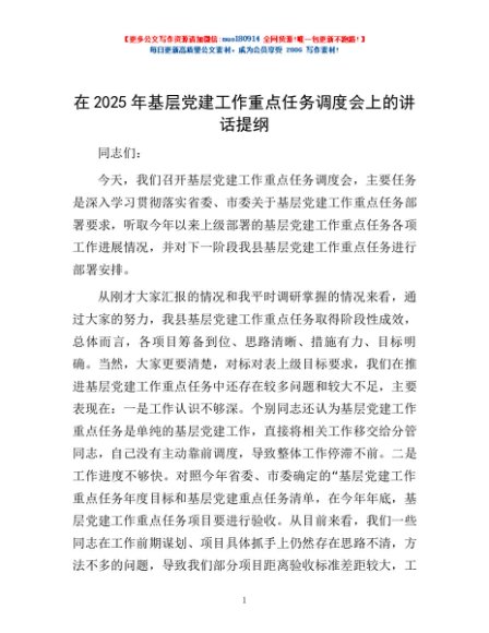 / 在2025年基层党建工作重点任务调度会上的讲话提纲