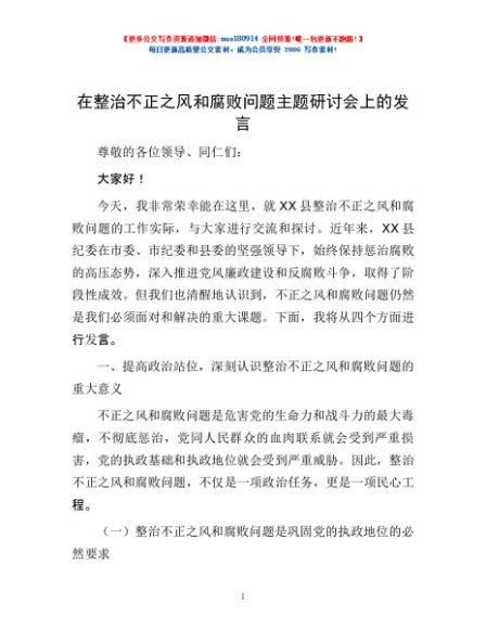 / 在整治不正之风和腐败问题主题研讨会上的发言