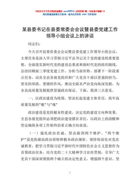 / 某县委书记在县委常委会会议暨县委党建工作领导小组会议上的讲话
