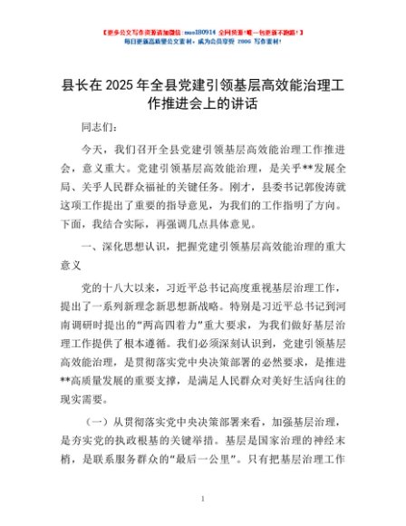 / 县长在2025年全县党建引领基层高效能治理工作推进会上的讲话