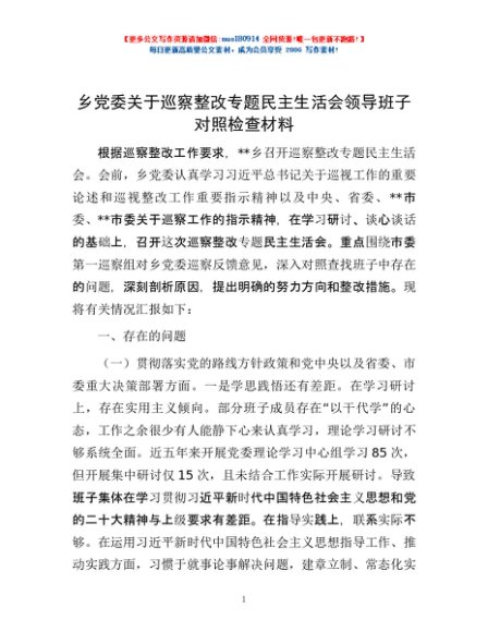 / 乡党委关于巡察整改专题民主生活会领导班子对照检查材料
