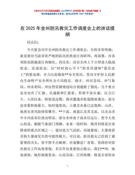 / 在2025年全州防汛救灾工作调度会上的讲话提纲