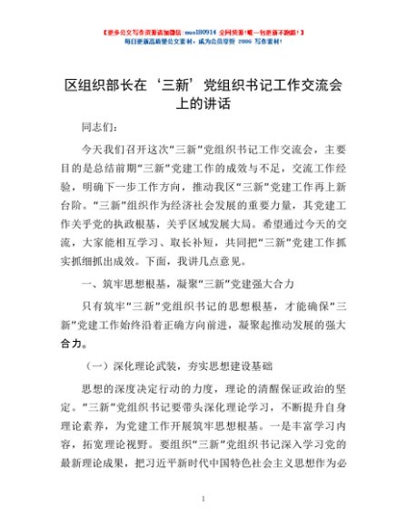 / 区组织部长在‘三新’党组织书记工作交流会上的讲话