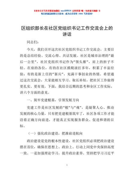 / 区组织部长在社区党组织书记工作交流会上的讲话