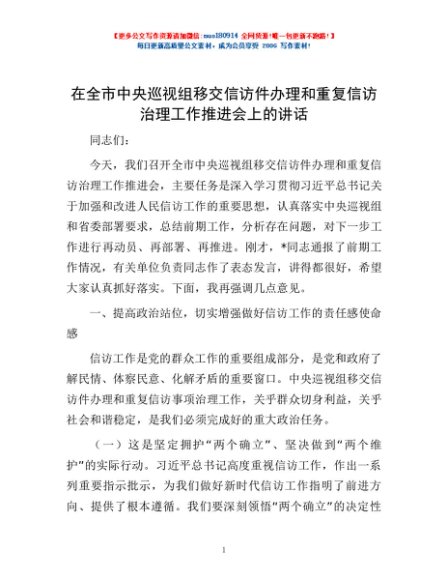 / 在全市中央巡视组移交信访件办理和重复信访治理工作推进会上的讲话
