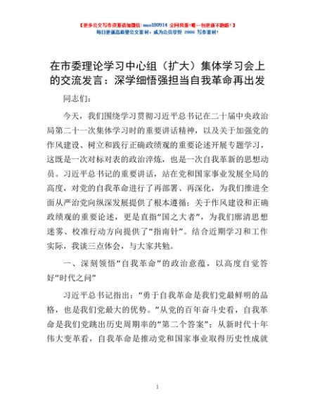 / 在市委理论学习中心组(扩大)集体学习会上的交流发言:深学细悟强担当自我革命再出发