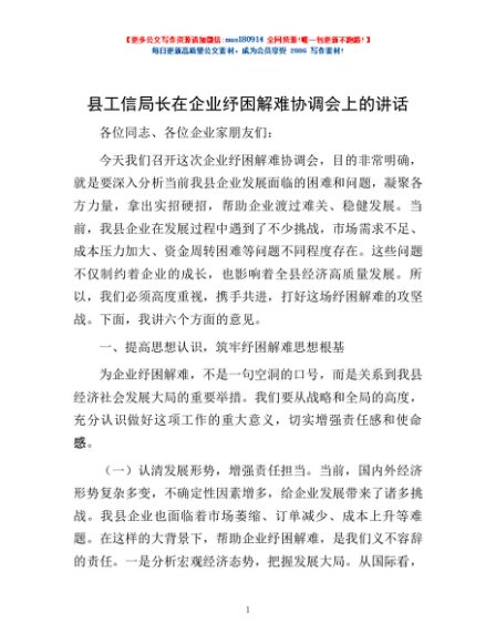 / 县工信局长在企业纾困解难协调会上的讲话