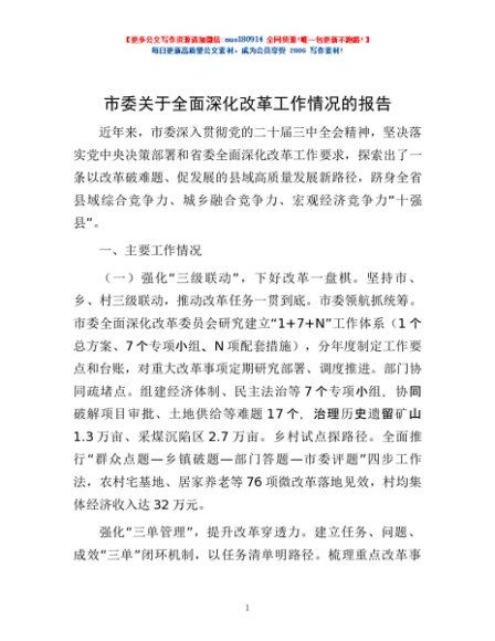 / 市委关于全面深化改革工作情况的报告