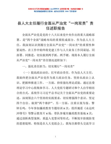 / 县人大主任履行全面从严治党“一岗双责”责任述职报告