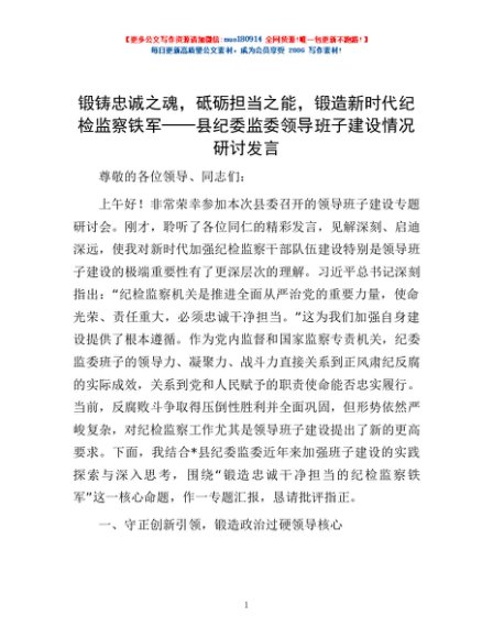 / 锻铸忠诚之魂,砥砺担当之能,锻造新时代纪检监察铁军——县纪委监委领导班子建设情况研讨发言