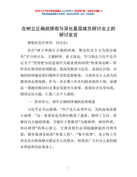 / 在树立正确政绩观与深化基层减负研讨会上的研讨发言