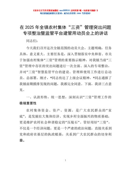 / 在2025年全镇农村集体“三资”管理突出问题专项整治暨监管平台建管用动员会上的讲话