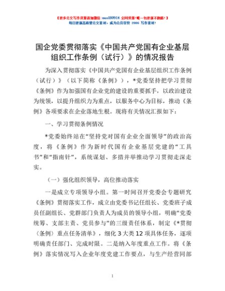 / 国企党委贯彻落实《中国共产党国有企业基层组织工作条例(试行)》的情况报告