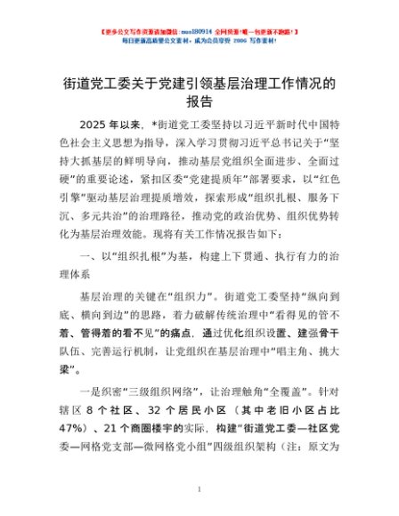 / 街道党工委关于党建引领基层治理工作情况的报告