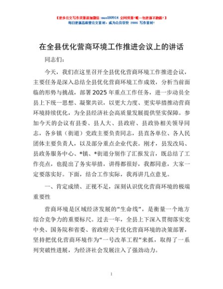 / 在全县优化营商环境工作推进会议上的讲话