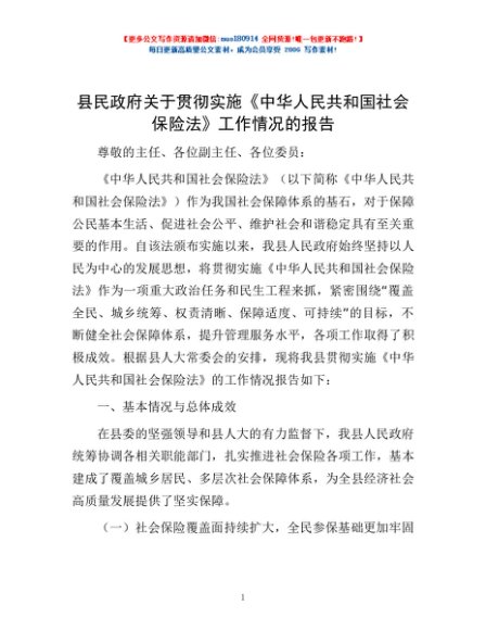 / 县民政府关于贯彻实施《中华人民共和国社会保险法》工作情况的报告