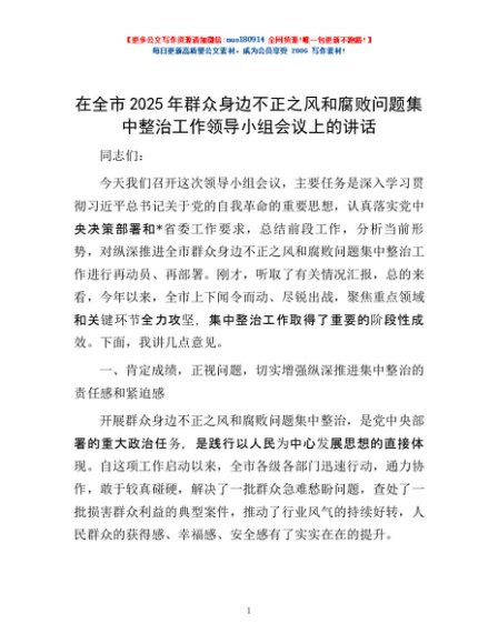 / 在全市2025年群众身边不正之风和腐败问题集中整治工作领导小组会议上的讲话