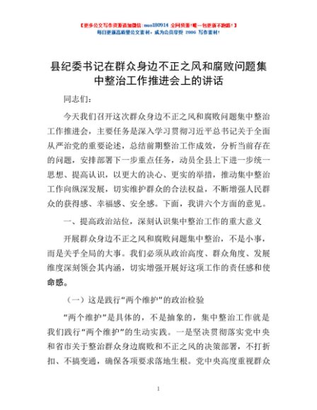 / 县纪委书记在群众身边不正之风和腐败问题集中整治工作推进会上的讲话