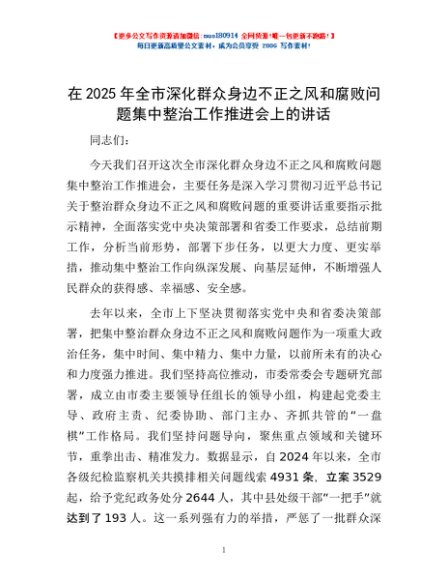 / 在2025年全市深化群众身边不正之风和腐败问题集中整治工作推进会上的讲话