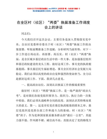 / 在全区村(社区)“两委”换届准备工作调度会上的讲话
