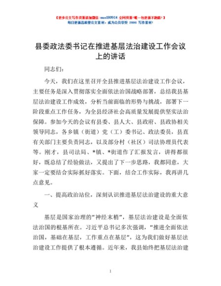 / 县委政法委书记在推进基层法治建设工作会议上的讲话
