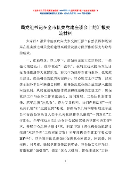 / 局党组书记在全市机关党建座谈会上的汇报交流材料