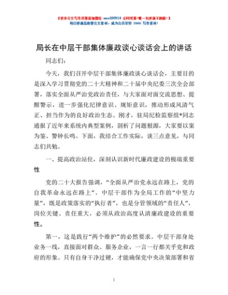 / 局长在中层干部集体廉政谈心谈话会上的讲话