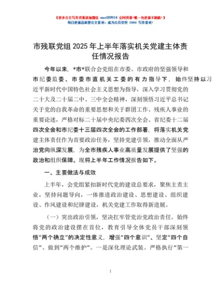 / 市残联党组2025年上半年落实机关党建主体责任情况报告