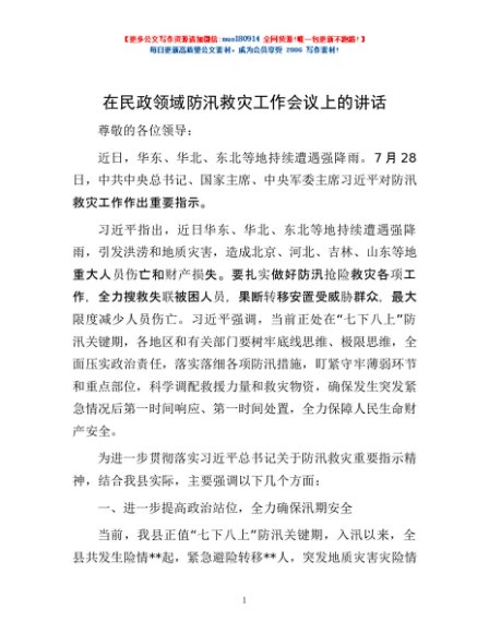 / 在民政领域防汛救灾工作会议上的讲话