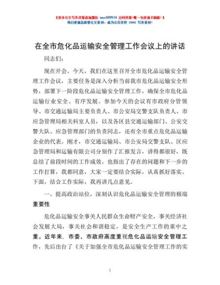 / 在全市危化品运输安全管理工作会议上的讲话