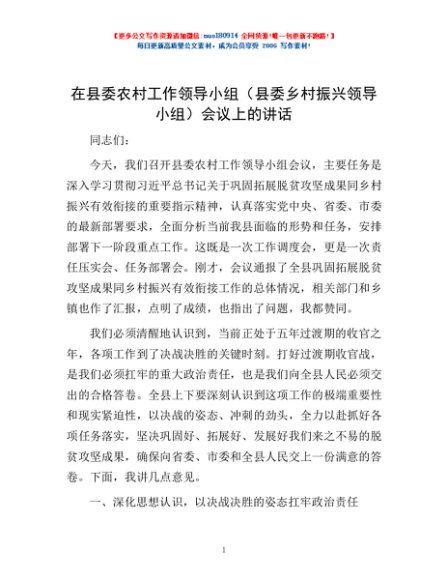 / 在县委农村工作领导小组(县委乡村振兴领导小组)会议上的讲话