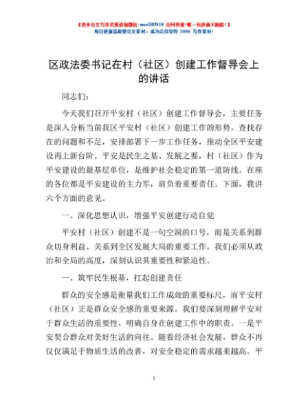 / 区政法委书记在村(社区)创建工作督导会上的讲话
