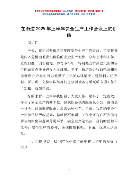 / 在街道2025年上半年安全生产工作会议上的讲话