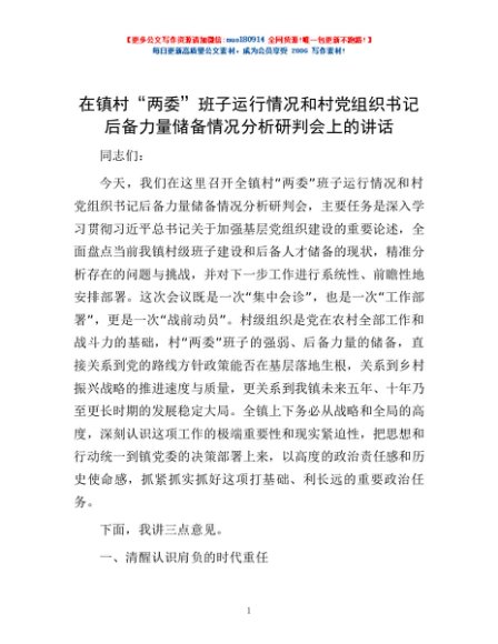 / 在镇村“两委”班子运行情况和村党组织书记后备力量储备情况分析研判会上的讲话